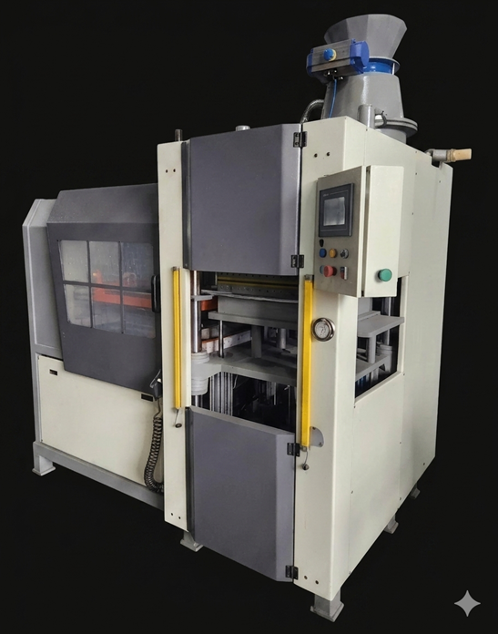 Equipamento automático para moldação em areia verde com compactação hidráulica, sopro de areia com caixa fluidizadora e controle eletrônico de pressão. Projeto e manutenção 100% nacionais, com acesso simplificado a peças e suporte técnico.